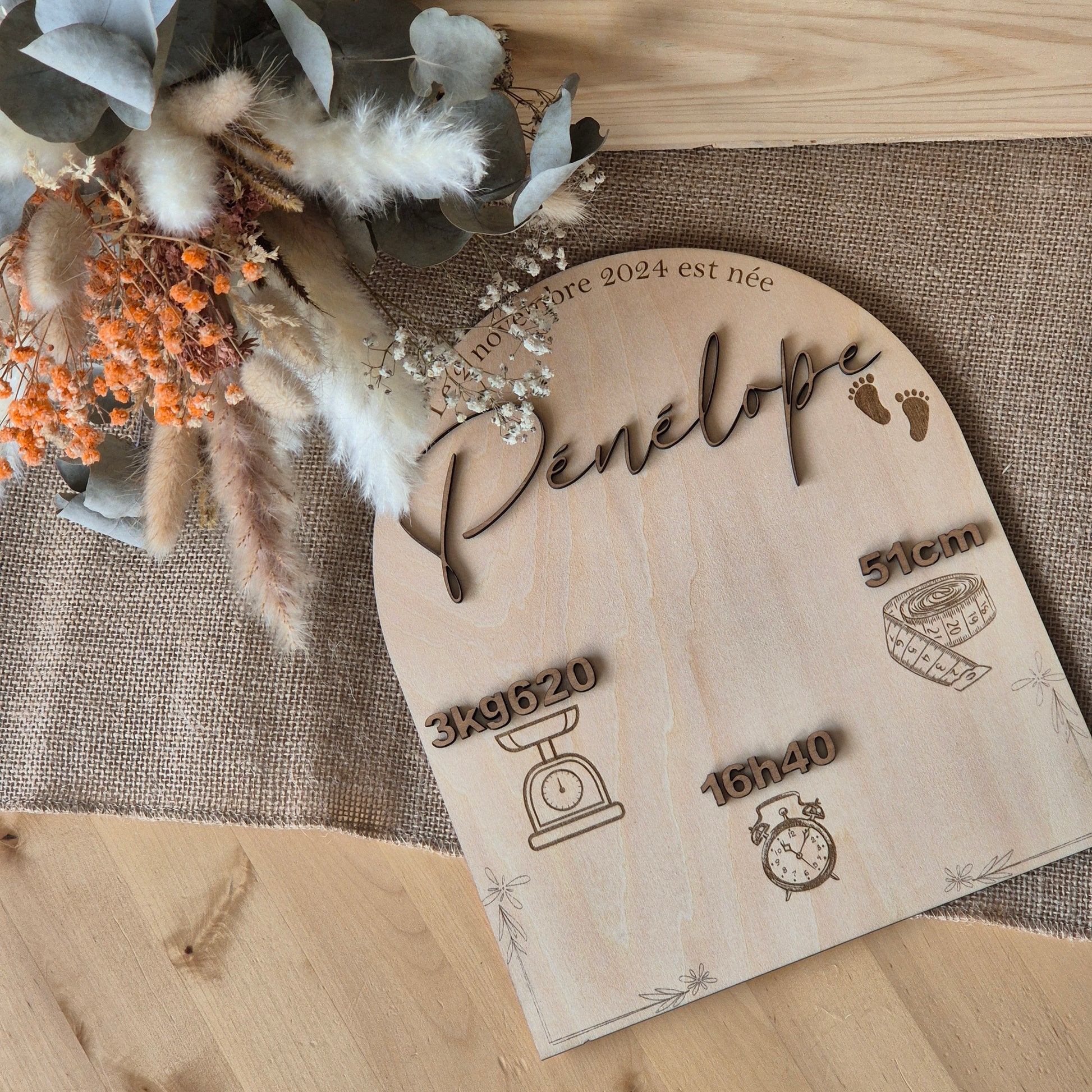 Célébrez l’arrivée de votre bébé avec cette pancarte de naissance en bois gravé, délicatement conçue pour immortaliser les premiers instants de sa vie.